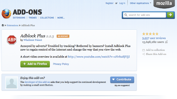 For Firefox, you can install Adblock Plus by visiting the Firefox installation page and clicking on the install button. Confirm the installation by clicking "Allow" on the first one, and "Install Now" on the second. Out of the box, Adblock Plus automatically blocks all those annoying video ads from YouTube.